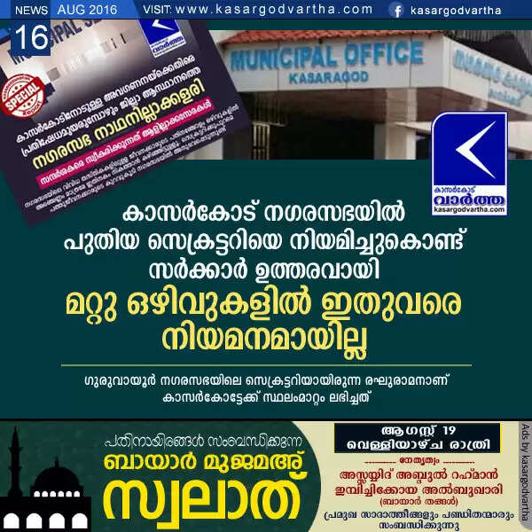 കാസര്കോട് നഗരസഭയില് പുതിയ സെക്രട്ടറിയെ നിയമിച്ചുകൊണ്ട് സര്ക്കാര് ഉത്തരവായി; മറ്റു ഒഴിവുകളില് ഇതുവരെ നിയമനമായില്ല