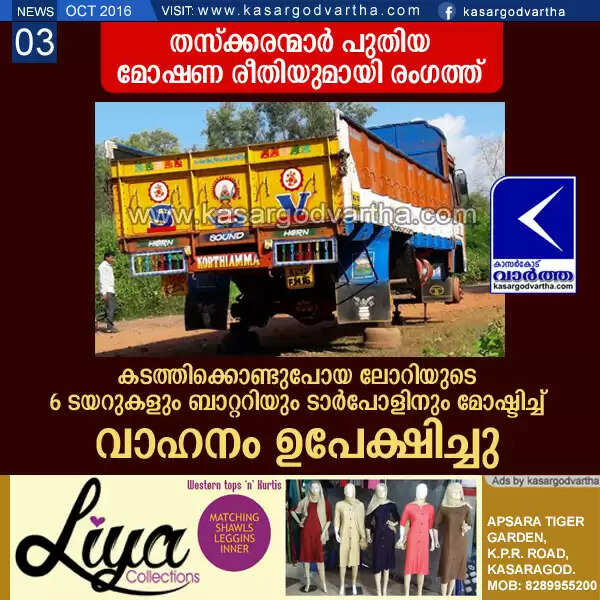 തസ്ക്കരന്മാര് പുതിയ മോഷണ രീതിയുമായി രംഗത്ത്; കടത്തിക്കൊണ്ടുപോയ ലോറിയുടെ 6 ടയറുകളും ബാറ്ററിയും ടാര്പോളിനും മോഷ്ടിച്ച് വാഹനം ഉപേക്ഷിച്ചു