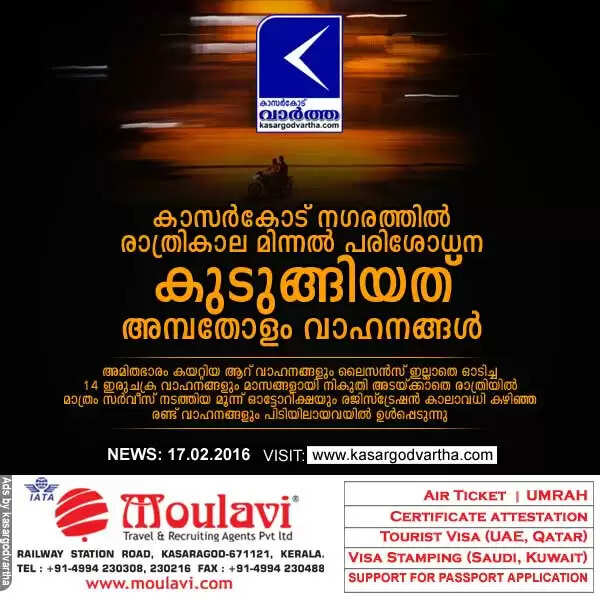 കാസര്കോട്: (www.kasargodvartha.com 17/02/2016) നഗരത്തിലും സമീപ പ്രദേശങ്ങളിലും രാത്രിയില് നടത്തിയ വാഹന പരിശോധനയില് കുടുങ്ങിയത് അമ്പതോളം വാഹനങ്ങള്. അമിതഭാരം കയറ്റിയ ആറ് വാഹനങ്ങളും ലൈസന്സ് ഇല്ലാതെ ഓടിച്ച 14 ഇരുചക്ര വാഹനങ്ങളും മാസങ്ങളായി നികുതി അടയ്ക്കാതെ രാത്രിയില് മാത്രം സര്വീസ് നടത്തിയ മൂന്ന് ഓട്ടോറിക്ഷയും രജിസ്ട്രേഷന് കാലാവധി കഴിഞ്ഞ രണ്ട് വാഹനങ്ങളും പിടിയിലായവയില് ഉള്പ്പെടുന്നു.
