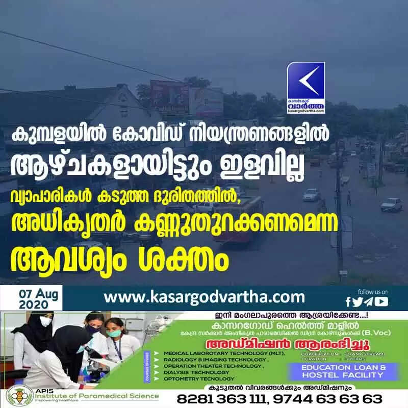 കുമ്പളയില് കോവിഡ് നിയന്ത്രണങ്ങളില് ആഴ്ചകളായിട്ടും ഇളവില്ല; വ്യാപാരികള് കടുത്ത ദുരിതത്തില്, അധികൃതര് കണ്ണുതുറക്കണമെന്ന ആവശ്യം ശക്തം