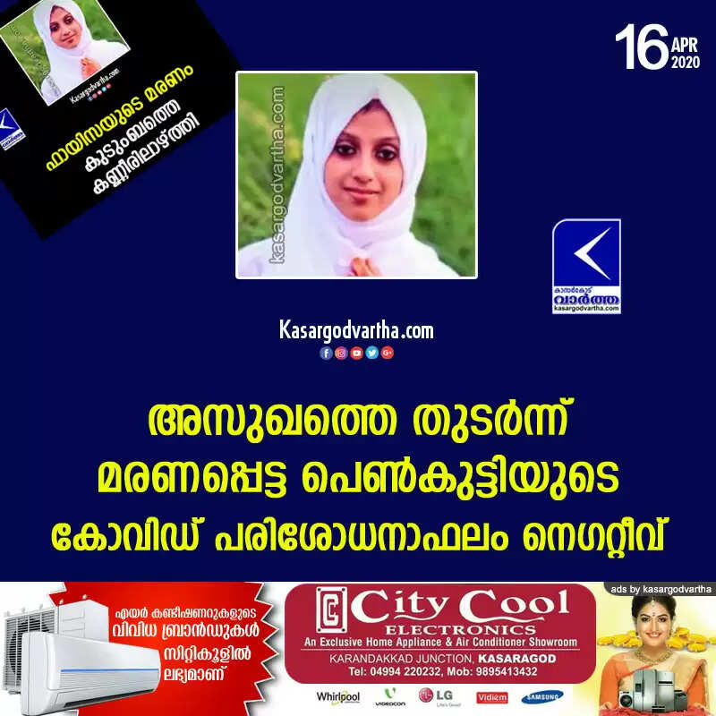 അസുഖത്തെ തുടര്ന്ന് മരണപ്പെട്ട പെണ്കുട്ടിയുടെ കോവിഡ് പരിശോധനാഫലം നെഗറ്റീവ്