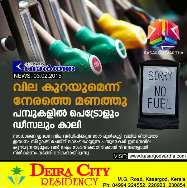 കാസര്‍കോട്: (www.kasargodvartha.com 03/02/2015) വില കുറയുമെന്ന് നേരത്തെ മണത്തറിഞ്ഞ പമ്പുടമകള്‍ പെട്രോളും ഡീസലും സ്‌റ്റോക്ക് ചെയ്യാതിരുന്നതിനാല്‍ പമ്പുകളില്‍ ഇന്ധനം നിറക്കാനെത്തിയവര്‍ കുഴഞ്ഞു. സാധാരണ ഇന്ധന വില വര്‍ധിപ്പിക്കുമ്പോള്‍ മുന്‍കൂട്ടി വലിയ രീതിയില്‍ ഇന്ധനം സ്‌റ്റോക്ക് ചെയ്ത് ലാഭംകൊയ്യുന്ന പമ്പുടമകള്‍ ഇന്ധനവില കുറയുന്നതുമൂലം വന്‍ നഷ്ടം സംഭവിക്കാതിരിക്കാന്‍ ദിവസങ്ങളായി നിരീക്ഷണം നടത്തിവരികയായിരുന്നു.