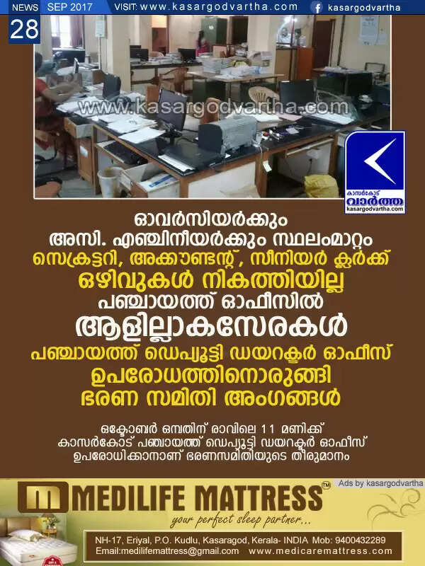 ഓവര്സിയര്ക്കും അസി. എഞ്ചിനീയര്ക്കും സ്ഥലംമാറ്റം; സെക്രട്ടറി, അക്കൗണ്ടന്റ്, സീനിയര് ക്ലര്ക്ക് ഒഴിവുകള് നികത്തിയില്ല; പഞ്ചായത്ത് ഓഫീസില് ആളില്ലാകസേരകള്, പഞ്ചായത്ത് ഡെപ്യൂട്ടി ഡയറക്ടര് ഓഫീസ് ഉപരോധത്തിനൊരുങ്ങി ഭരണ സമിതി അംഗങ്ങള്