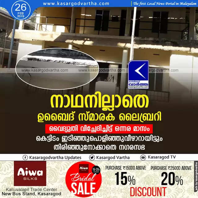 നാഥനില്ലാതെ ഉബൈദ് സ്മാരക ലൈബ്രറി; വൈദ്യുതി വിച്ഛേദിച്ചിട്ട് ഒന്നര മാസം, കെട്ടിടം ഇടിഞ്ഞുപൊളിഞ്ഞുവീഴാറായിട്ടും തിരിഞ്ഞുനോക്കാതെ നഗരസഭ
