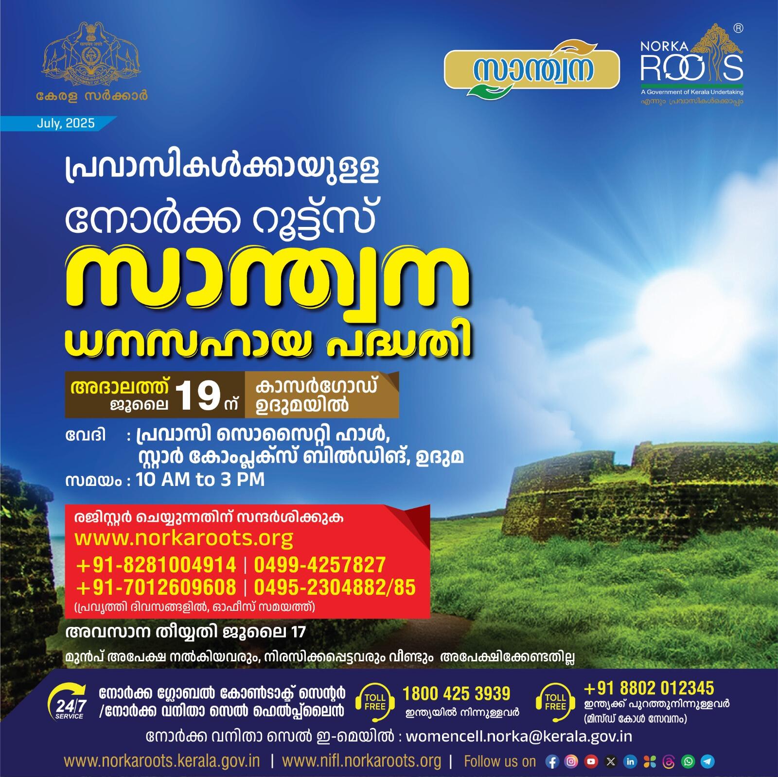 (KasargodVartha) നാട്ടിൽ തിരിച്ചെത്തിയ പ്രവാസികൾക്ക് സംസ്ഥാന സർക്കാർ നോർക്ക റൂട്ട്സ് വഴി നടപ്പാക്കിവരുന്ന സാന്ത്വന ധനസഹായ പദ്ധതിയുടെ അദാലത്ത് ജൂലൈ 19-ന് കാസർകോട് നടക്കും.