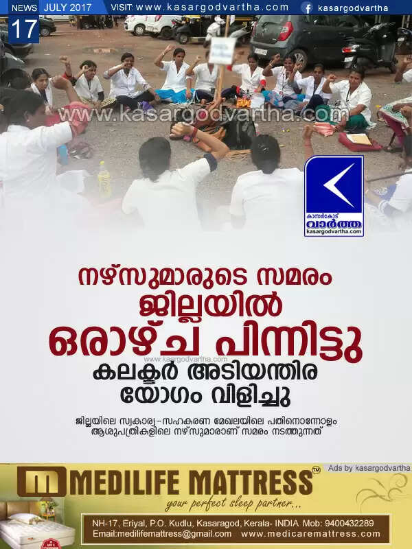 Keywords: Nurses strike enters second week; collector calls meeting, Kasaragod, Hospital, Court, CITU, General-Hospital, News, Kerala, Nurses strike enters second week; collector calls meeting