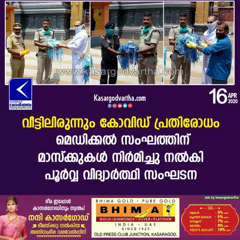 ആദ്യഘട്ടത്തില് 250 ഫേസ് മാസ്ക്കുകള് നിര്മ്മിച്ച് നല്കി. പാലക്കുന്ന് ശ്രീ ഭവതി ക്ഷേത്ര പരിസരത്ത് വെച്ച് നടന്ന ചടങ്ങില് മാസ്കുകള് അജിത്ത് സി കളനാടിന് കൈമാറി. പൂര്വ്വ വിദ്യാര്ത്ഥി സംഘടന പ്രസിഡണ്ട്, വൈസ് പ്രസിഡണ്ട്, സെക്രട്ടറി, പാലക്കുന്ന് ശ്രീ ഭഗവതി ക്ഷേത്രത്തിലെ പൂജാരി സുനീഷ് പൂജാരി, ബേക്കല് എസ് ഐ അജിത് കുമാര്, എ എസ് ഐ രാമകൃഷ്ണന് തുടങ്ങിയവര് സംബന്ധിച്ചു.