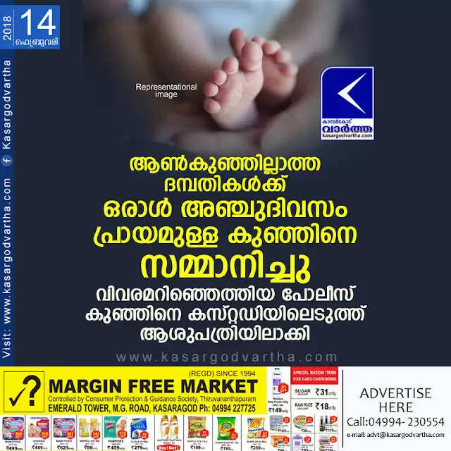 ആണ്കുഞ്ഞില്ലാത്ത ദമ്പതികള്ക്ക് ഒരാള് അഞ്ചുദിവസം പ്രായമുള്ള കുഞ്ഞിനെ സമ്മാനിച്ചു; വിവരമറിഞ്ഞെത്തിയ പോലീസ് കുഞ്ഞിനെ കസ്റ്റഡിയിലെടുത്ത് ആശുപത്രിയിലാക്കി