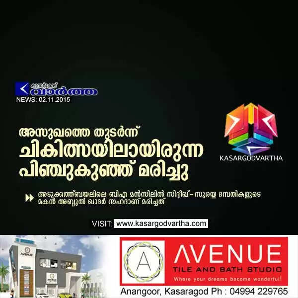 കാസര്‍കോട്: (www.kasargodvartha.com 02/11/2015) അസുഖത്തെ തുടര്‍ന്ന് ചികിത്സയിലായിരുന്ന ഒരു മാസം പ്രായമുള്ള കുഞ്ഞ് മരിച്ചു. അടുക്കത്ത്ബയലിലെ ബിഎ മന്‍സിലില്‍ സിദ്ദീഖ് - സുരയ്യ ദമ്പതികളുടെ മകന്‍ അബ്ദുല്‍ ഖാദര്‍ സഹദാണ് മരിച്ചത്.