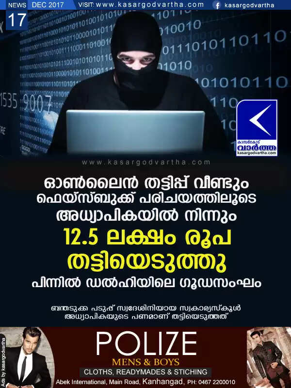 ഓണ്ലൈന് തട്ടിപ്പ് വീണ്ടും; ഫെയ്സ്ബുക്ക് പരിചയത്തിലൂടെ അധ്യാപികയില് നിന്നും 12. 5 ലക്ഷം രൂപ തട്ടിയെടുത്തു; പിന്നില് ഡല്ഹിയിലെ ഗൂഡസംഘം
