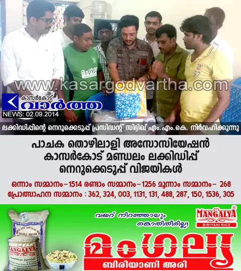 കാസര്കോട്:(www.kasargodvartha.com 02.09.2014) കാസര്കോട് പാചക തൊഴിലാളി അസോസിയേഷന് കാസര്കോട് മണ്ഡലം കമ്മിറ്റി നടത്തിയ ലക്കിഡിപ്പിന്റെ നെറുക്കെടുപ്പ് ജില്ലാ പ്രസിഡന്റ് സിദ്ദിഖ് എം.എം.കെ. നിര്വഹിച്ചു.