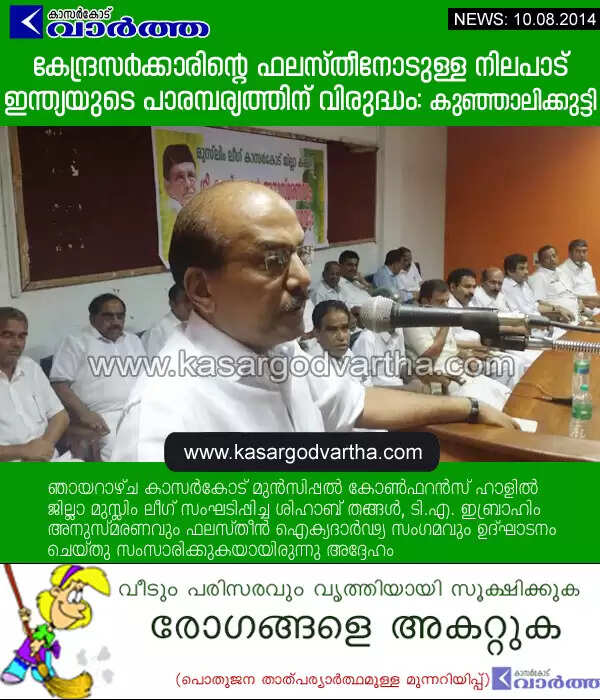 കാസര്കോട്: (www.kasargodvartha.com 10.08.2014) ബി.ജെ.പി.യുടെ നേതൃത്വത്തിലുളള കേന്ദ്രസര്ക്കാരിന്റെ ഫലസ്തീന് നയം ഇന്ത്യയുടെ മതേതര പാരമ്പര്യത്തിന് വിരുദ്ധമാണെന്ന് മുസ്ലിം ലീഗ് ദേശീയ ട്രഷററും വ്യവസായ - ഐ.ടി. വകുപ്പ് മന്ത്രിയുമായ പി.കെ. കുഞ്ഞാലിക്കുട്ടി പറഞ്ഞു. ഞായറാഴ്ച കാസര്കോട് മുന്സിപ്പല് കോണ്ഫറന്സ് ഹാളില് ജില്ലാ മുസ്ലിം ലീഗ് സംഘടിപ്പിച്ച ശിഹാബ് തങ്ങള്, ടി.എ. ഇബ്രാഹിം അനുസ്മരണവും ഫലസ്തീന് ഐക്യദാര്ഢ്യ സംഗമവും ഉദ്ഘാടനം ചെയ്തു സംസാരിക്കുകയായിരുന്നു അദ്ദേഹം.
