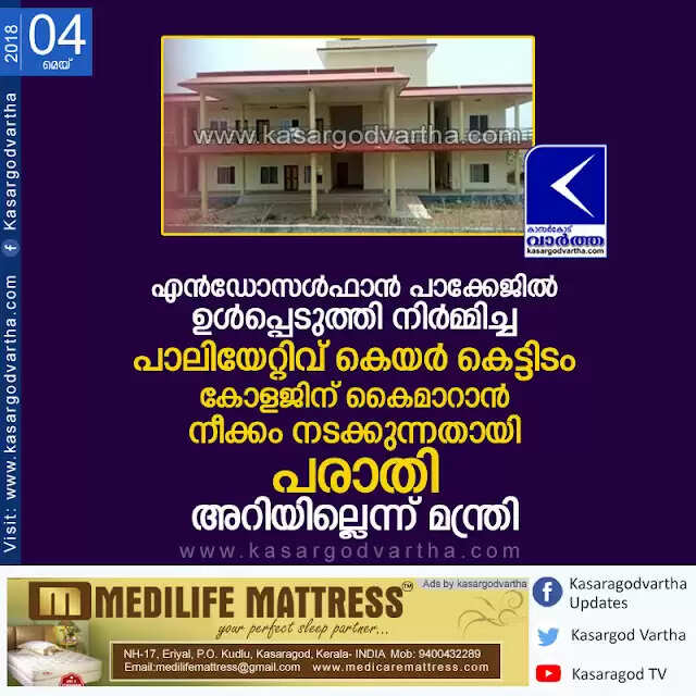 എന്ഡോസള്ഫാന് പാക്കേജില് ഉള്പ്പെടുത്തി നിര്മ്മിച്ച പാലിയേറ്റിവ് കെയര് കെട്ടിടം കോളജിന് കൈമാറാന് നീക്കം നടക്കുന്നതായി പരാതി, അറിയില്ലെന്ന് മന്ത്രി