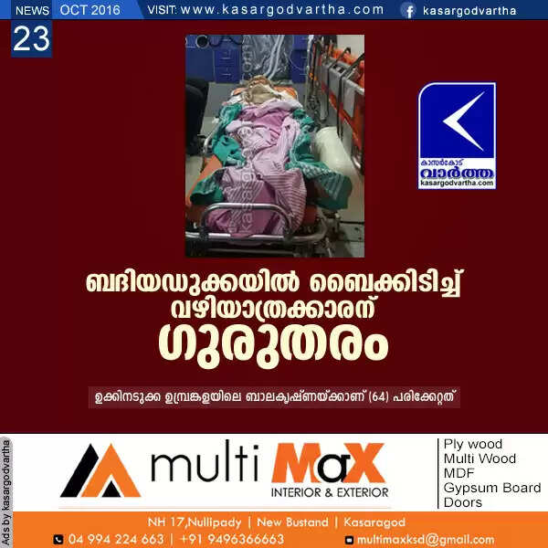 Keywords : Badiyadukka, Accident, Injured, Hospital, Bike, Kasaragod, Balakrishna, Passer-by injured in accident.