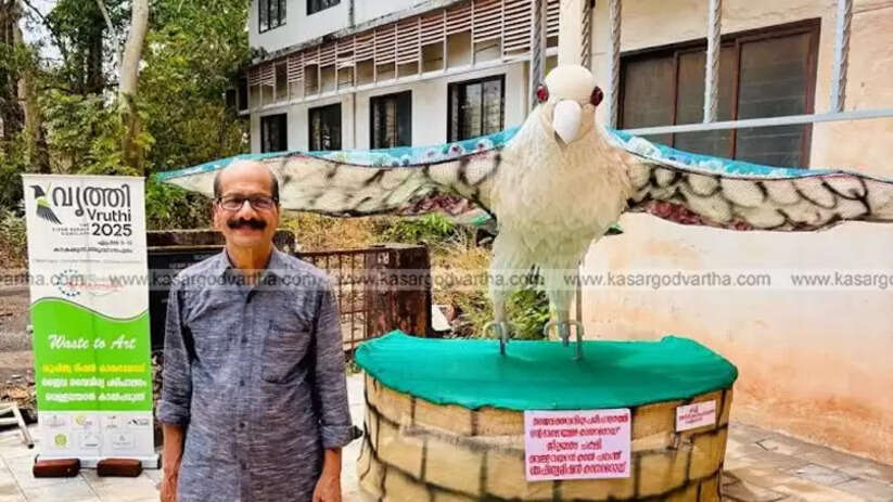 Article Summary: A stunning white-bellied sea eagle sculpture, crafted from waste materials by artist A.G. Narayanan as part of the 'Vrithi Conclave', now stands at the Kasaragod Collectorate, showcasing the beauty that can emerge from discarded items. Approximately 2000 plastic bottles were used in this creation, highlighting environmental consciousness.