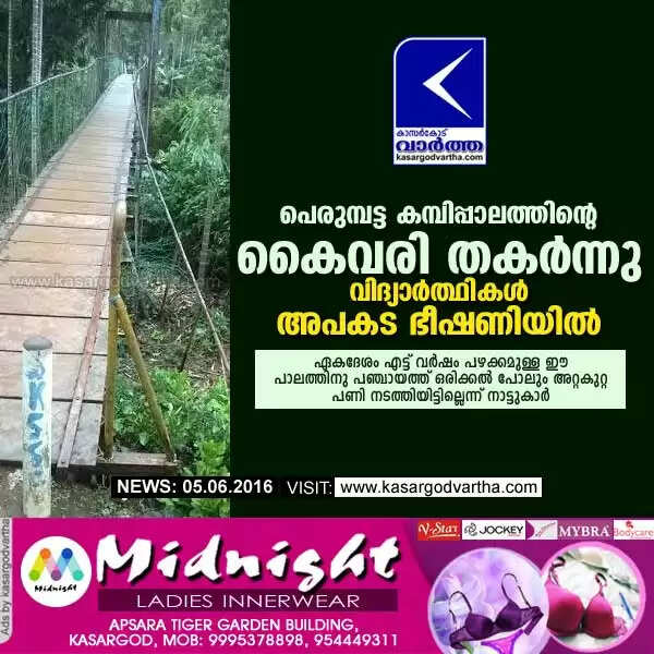 കുന്നുംകൈ: (www.kasargodvartha.com 05/06/2016) കൈവരികള്‍ പൂര്‍ണമായും തകര്‍ന്ന പെരുമ്പട്ടയിലെ കമ്പിപ്പാലം നാട്ടുകാര്‍ക്കും വിദ്യാര്‍ത്ഥികള്‍ക്കും ഭീഷണിയായി മാറുന്നു. 2008 ല്‍ പൂര്‍ത്തീകരിച്ച തൂക്ക് പാലത്തിനു ഇപ്പോള്‍ യാതൊരുവിധ സുരക്ഷയുമില്ലാത്തതിനാല്‍ വിദ്യാര്‍ത്ഥികള്‍ ഭീതിയോടെയാണ് കടന്നു പോകുന്നത്.