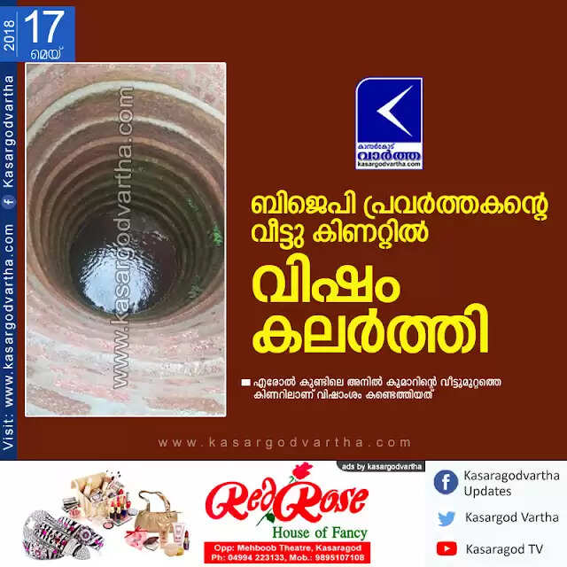 പൊയ്‌നാച്ചി: (www.kasargodvartha.com 17.05.2018) ബിജെപി പ്രവര്‍ത്തകന്റെ വീട്ടിലെ കിണറില്‍ വിഷം കലര്‍ത്തിയ നിലയില്‍ കാണപ്പെട്ടു. എരോല്‍ കുണ്ടിലെ അനില്‍ കുമാറിന്റെ വീട്ടുമുറ്റത്തെ കിണറിലാണ് വിഷാംശം കണ്ടെത്തിയത്. രാവിലെ കിണറില്‍ നിന്നും വെള്ളം കോരിയെടുക്കുമ്പോഴാണ് ശ്രദ്ധയില്‍പെട്ടത്. നിറവ്യത്യാസവും രൂക്ഷഗന്ധവും അനുഭവപ്പെട്ടു.