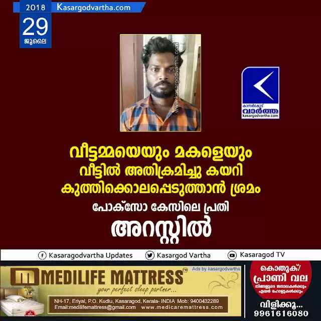 ഉദുമ:(www.kasargodvartha.com 29/07/2018) വീട്ടമ്മയെയും മകളെയും വീട്ടില്‍ അതിക്രമിച്ചു കയറി കുത്തി കൊലപ്പെടുത്താന്‍ ശ്രമിച്ചതിന് പോക്‌സോ കേസിലെ പ്രതി അറസ്റ്റില്‍. ഉദുമ ബാര അരമങ്ങാനത്തെ കെ.സജിത്തിനെ(25)യാണ് ബേക്കല്‍ എസ്.ഐ വിനോദ് കുമാറും സംഘവും ചേര്‍ന്ന് അറസ്റ്റ് ചെയ്തത്. ശനിയാഴ്ച രാത്രി 12 മണിയോടെ സജിത്ത് മദ്യലഹരിയില്‍ 40 കാരിയായ വീട്ടമ്മയെയും 19 വയസ്സുള്ള മകളെയും അവര്‍ താമസിക്കുന്ന വീട്ടില്‍ അതിക്രമിച്ചു കയറിയാണ് കുത്തി കൊലപ്പെടുത്താന്‍ ശ്രമിച്ചത്.