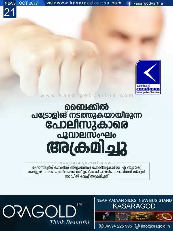 കാഞ്ഞങ്ങാട്: (www.kasargodvartha.com 21.10.2017) ക്രമസമാധാനപാലനത്തിന്റെ ഭാഗമായി പോലീസ് ബൈക്കില് റോന്തുചുറ്റുകയായിരുന്ന പോലീസുകാരെ പൂവാലസംഘം അക്രമിച്ച് പരിക്കേല്പ്പിച്ചു. ഹൊസ്ദുര്ഗ് പോലീസ് സ്റ്റേഷനിലെ പോലീസുകാരായ എ സുമേഷ്, അബ്ദുല് സലാം എന്നിവരെയാണ് ഇക്ബാല് ഹയര്സെക്കന്ഡറി സ്കൂള് റോഡില് വെച്ച് അക്രമിച്ചത്.