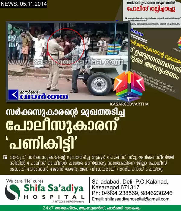 Keywords : Kasaragod, Kerala, Police, Suspension, Bovikanam, Assault, Santhosh, Shaji, Complaint, Police constable suspended for assaulting man.