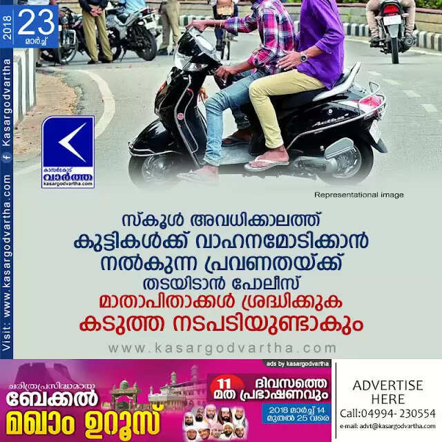 കാസര്‍കോട്: (www.kasargodvartha.com 23.03.2018) പരീക്ഷ കഴിഞ്ഞ് സ്‌കൂള്‍ അവധി ആഘോഷിക്കാനുള്ള ഒരുക്കത്തിലാണ് വിദ്യാര്‍ത്ഥികള്‍. അവധിക്കാലം ഉല്ലസിക്കുന്നതിന്റെ ഭാഗമായി കുട്ടികള്‍ വാഹനങ്ങളുമായി കറങ്ങുന്ന പ്രവണത ഈ ദിവസങ്ങളില്‍ കൂടുതലായിരിക്കും. ഇതിന് തടയിടാന്‍ ശക്തമായ മുന്നറിയിപ്പുമായി പോലീസ് രംഗത്ത് വന്നു. കുട്ടികള്‍ക്ക് വാഹനങ്ങള്‍ ഓടിക്കാന്‍ നല്‍കുന്നത് മാതാപിതാക്കളായാലും ബന്ധുക്കളായാലും മറ്റാരെങ്കിലുമായാലും കര്‍ശനമായ നടപടികള്‍ സ്വീകരിക്കുമെന്ന് പോലീസ് മുന്നറിയിപ്പ് നല്‍കി.