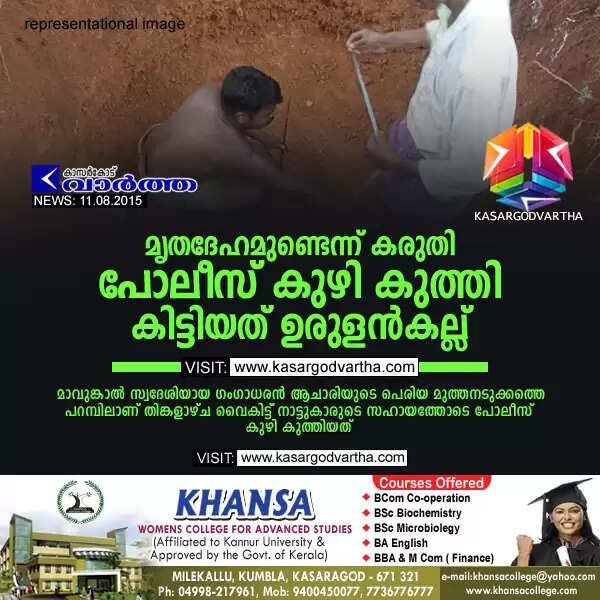 പെരിയ: (www.kasargodvartha.com 11/08/2015) മൃതദേഹമുണ്ടെന്ന സംശയത്തില് നാട്ടുകാരുടെ സഹായത്തോടെ പോലീസ് കുഴി കുത്തിയപ്പോള് ലഭിച്ചത് ഉരുളന്കല്ല് മാത്രം. മാവുങ്കാല് സ്വദേശിയായ ഗംഗാധരന് ആചാരിയുടെ പെരിയ മുത്തനടുക്കത്തെ പറമ്പിലാണ് തിങ്കളാഴ്ച വൈകിട്ട് നാട്ടുകാരുടെ സഹായത്തോടെ പോലീസ് കുഴി കുത്തിയത്.