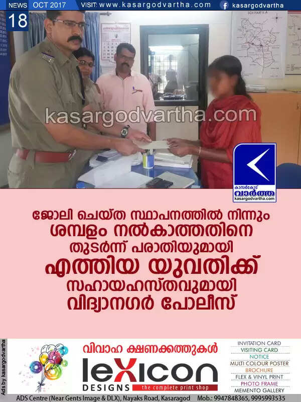 ജോലി ചെയ്ത സ്ഥാപനത്തില് നിന്നും ശമ്പളം നല്കാത്തതിനെ തുടര്ന്ന് പരാതിയുമായി എത്തിയ യുവതിക്ക് സഹായഹസ്തവുമായി വിദ്യാനഗര് പോലീസ്