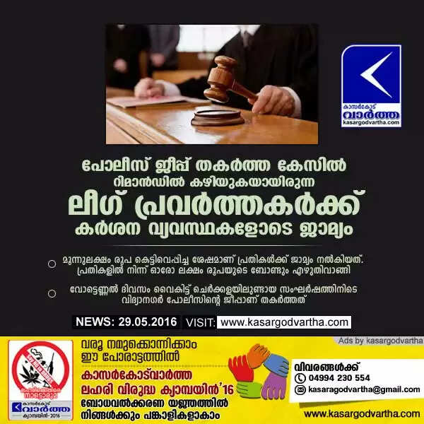 പോലീസ് ജീപ്പ് തകര്ത്ത കേസില് റിമാന്ഡില് കഴിയുകയായിരുന്ന ലീഗ് പ്രവര്ത്തകര്ക്ക് കര്ശന വ്യവസ്ഥകളോടെ ജാമ്യം