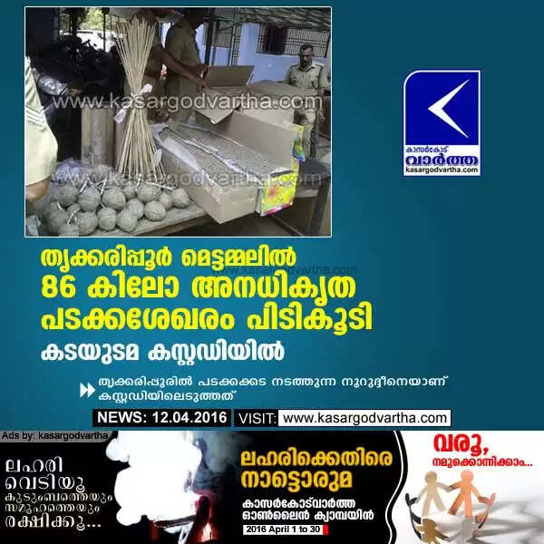 തൃക്കരിപ്പൂര് മെട്ടമ്മലില് 86 കിലോ അനധികൃത പടക്കശേഖരം പിടികൂടി; കടയുടമ കസ്റ്റഡിയില്