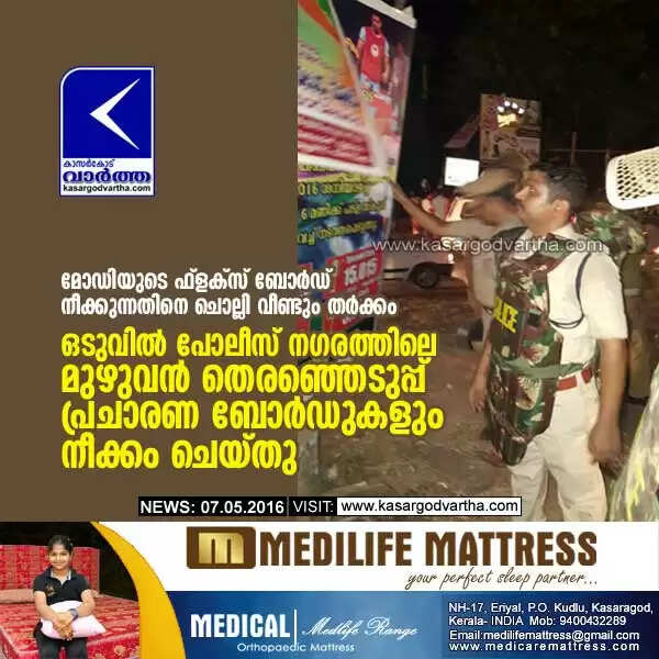 Keywords: Police removes all election boards around the cityKasaragod, BJP, Flex Board, Police, Election 2016, Vidhyanagar, Karandhakkad, CI, Old Bus Stand, Kasaragod DYSP.