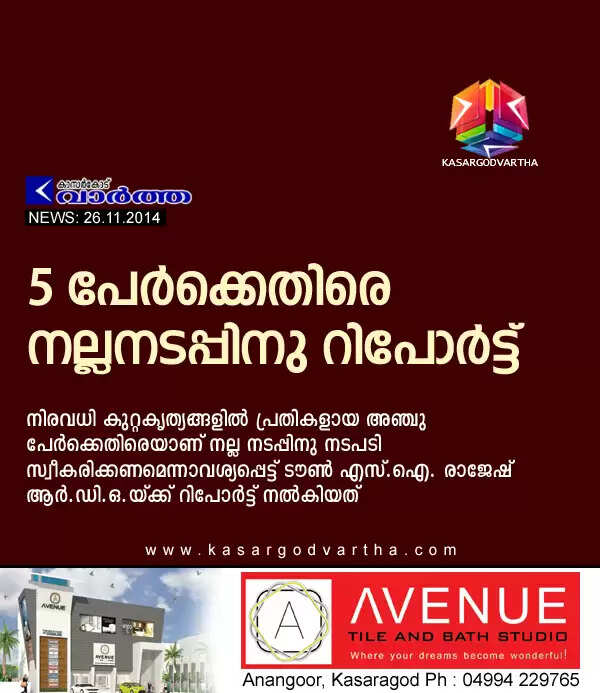 കാസര്കോട്: (www.kasargodvartha.com 26.11.2014) നിരവധി കുറ്റകൃത്യങ്ങളില് പ്രതികളായ അഞ്ചു പേര്ക്കെതിരെ നല്ല നടപ്പിനു നടപടി സ്വീകരിക്കണമെന്നാവശ്യപ്പെട്ട് ടൗണ് എസ്.ഐ. രാജേഷ് ആര്.ഡി.ഒ.യ്ക്ക് റിപോര്ട്ട് നല്കി.