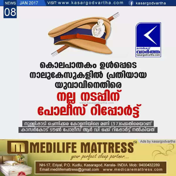 കൊലപാതകം ഉള്പ്പെടെ നാലുകേസുകളില് പ്രതിയായ യുവാവിനെതിരെ നല്ല നടപ്പിന് പോലീസ് റിപ്പോര്ട്ട്