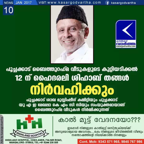 പൂച്ചക്കാട് ബൈത്തുറഹ് മ വീടുകളുടെ കുറ്റിയടിക്കല്‍ 12 ന് ഹൈദരലി ശിഹാബ് തങ്ങള്‍ നിര്‍വഹിക്കും