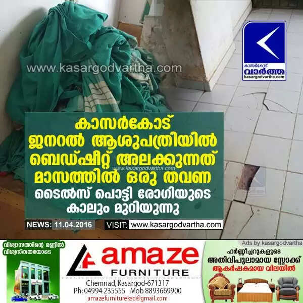 കാസര്കോട് ജനറല് ആശുപത്രിയില് ബെഡ്ഷീറ്റ് അലക്കുന്നത് മാസത്തില് ഒരു തവണ, ടൈല്സ് പൊട്ടി രോഗിയുടെ കാലും മുറിയുന്നു
