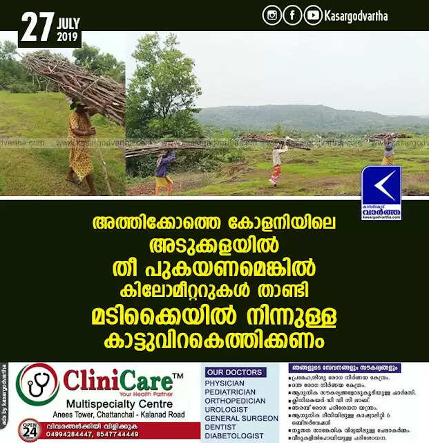 കാഞ്ഞങ്ങാട്:(www.kasargodvartha.com 27/07/2019) വീടുകള്‍ തോറും ഗ്യാസ് അടുപ്പുകള്‍, ഇലക്ട്രിക് ചൂളകള്‍... പക്ഷെ അത്തിക്കോത്തെ കോളനിയിലെ വീട്ടമ്മമാര്‍ക്ക് അടുക്കളയില്‍ തീ പുകയണമെങ്കില്‍ ഇപ്പോഴും മടിക്കൈയില്‍ നിന്നുള്ള കാട്ടുവിറകെത്തിക്കണം. കാഞ്ഞങ്ങാട് നഗരസഭയിലെ അത്തിക്കോത്ത് കോളനി നിവാസികള്‍ വിറകുകള്‍ ശേഖരിക്കാന്‍ കിലോമീറ്ററുകള്‍ കാല്‍നടയായി നീങ്ങുന്ന കാഴ്ച പുതിയ തലമുറയ്ക്ക് കൗതുകമാണ്.