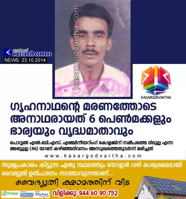 ബോവിക്കാനം: (www.kasargodvartha.com 23.10.2014)  ഗൃഹനാഥന്റെ മരണത്തോടെ അനാഥരായത് ആറ് പെണ്‍മക്കളും ഭാര്യയും വൃദ്ധമാതാവും. പൊവ്വല്‍ എല്‍.ബി.എസ്. എഞ്ചിനീയറിംഗ് കോളജിന് സമീപത്തെ ദിദുല്ല എന്ന അബ്ദുല്ല (46) യാണ് കഴിഞ്ഞദിവസം അസുഖത്തെതുടര്‍ന്ന് മരിച്ചത്.