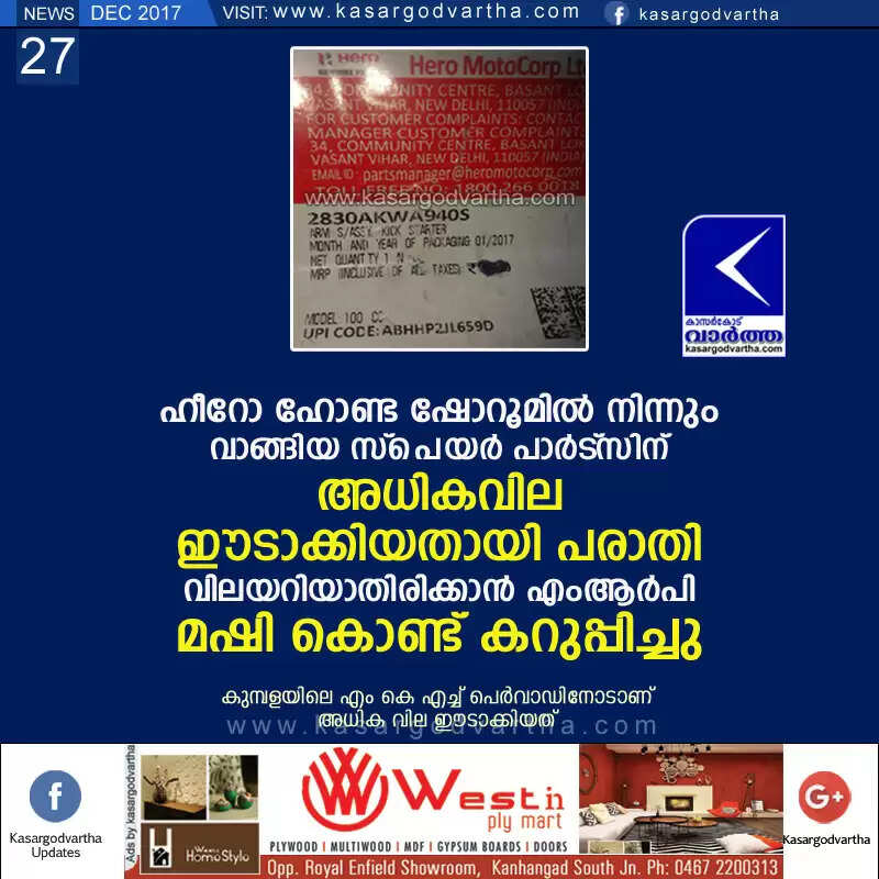 ഹീറോ ഹോണ്ട ഷോറൂമില് നിന്നും വാങ്ങിയ സ്പെയര് പാര്ട്സിന് അധികവില ഈടാക്കിയതായി പരാതി; വിലയറിയാതിരിക്കാന് എംആര്പി മഷി കൊണ്ട് കറുപ്പിച്ചു