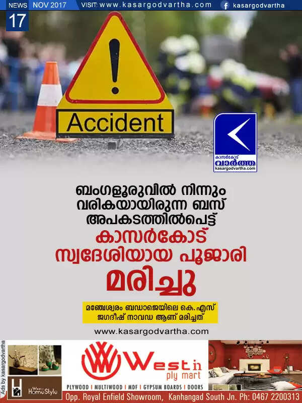 ബംഗളൂരുവില് നിന്നും വരികയായിരുന്ന ബസ് അപകടത്തില്പെട്ട് കാസര്കോട് സ്വദേശിയായ പൂജാരി മരിച്ചു
