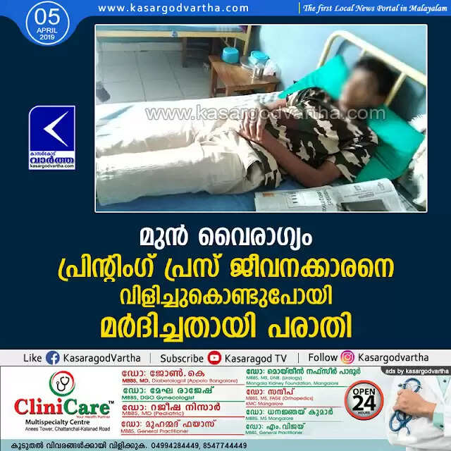 മുന് വൈരാഗ്യം; പ്രിന്റിംഗ് പ്രസ് ജീവനക്കാരനെ വിളിച്ചുകൊണ്ടുപോയി മര്ദിച്ചതായി പരാതി