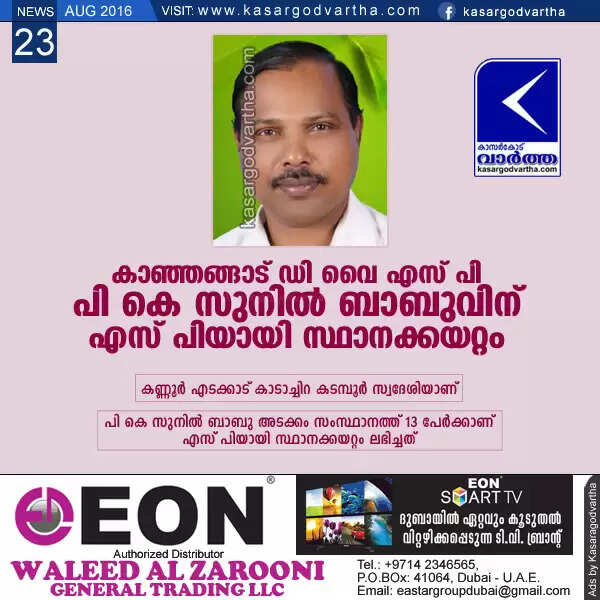 കാഞ്ഞങ്ങാട് ഡി വൈ എസ് പി കെ കെ സുനില് ബാബുവിന് എസ് പിയായി സ്ഥാനക്കയറ്റം