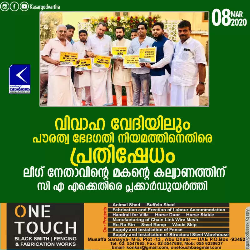 വിവാഹ വേദിയിലും പൗരത്വ ഭേദഗതി നിയമത്തിനെതിരെ പ്രതിഷേധം; ലീഗ് നേതാവിന്റെ മകന്റെ കല്യാണത്തിന് സി എ എക്കെതിരെ പ്ലക്കാര്‍ഡുയര്‍ത്തി