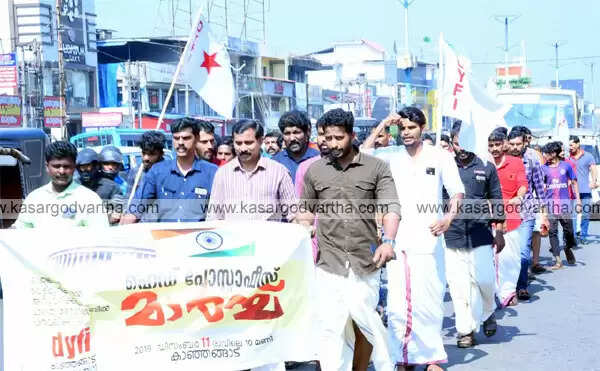 കാഞ്ഞങ്ങാട്: രാജ്യത്തെ വെട്ടി മുറിക്കാന്‍ അനുവദിക്കില്ല. പൗരത്വ ഭേദഗതി ബില്‍ പിന്‍വലിക്കുക എന്നാവിശ്യപ്പെട്ടുകൊണ്ട് ഡിവൈഎഫ്‌ഐ കാഞ്ഞങ്ങാട് ബ്ലോക്ക് കമ്മിറ്റിയുടെ നേതൃത്വത്തില്‍ ഹെഡ് പോസ്റ്റോഫീസ് മാര്‍ച്ച് സംഘടിപ്പിച്ചു. ജില്ലാ സെക്രട്ടറി സി ജെ സജിത്ത് മാര്‍ച്ച് ഉദ്ഘാടനം ചെയ്തു. ബ്ലോക്ക് പ്രസിഡന്റ് വിപിന്‍ കാറ്റാടി അധ്യക്ഷനായി. കെ സബീഷ്, വി. ഗിനീഷ് എന്നിവര്‍ സംസാരിച്ചു. പ്രിയേഷ്. എന്‍ സ്വാഗതം പറഞ്ഞു.