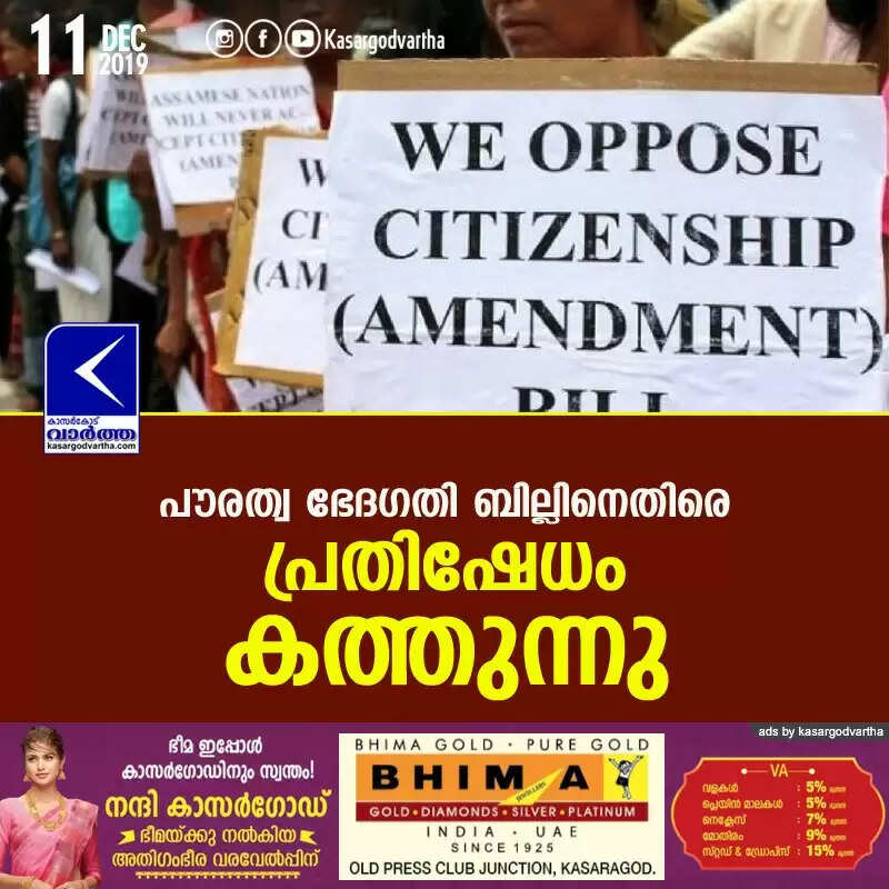(www.kasargodvartha.com 11.12.2019) കേന്ദ്ര സര്‍ക്കാര്‍ നടപ്പിലാക്കിയ പൗരത്വ ഭേദഗതി ബില്ലിനെതിരെ രാജ്യമെങ്ങും പ്രതിഷേധം ശക്തമായി. ഇതിനെതിരെ വിവിധ സംഘടനകളാണ് മുന്നിറങ്ങിയിരിക്കുന്നത്. രാജ്യത്തെ മതേതരത്ത്വം തകര്‍ക്കുന്ന നിലപാടാണ് കേന്ദ്ര സര്‍ക്കാര്‍ പൗരത്ത്വ ബില്ലിലൂടെ നടപ്പാക്കുന്നതെന്ന് സംഘടനകള്‍ ആരോപിക്കുന്നത്.