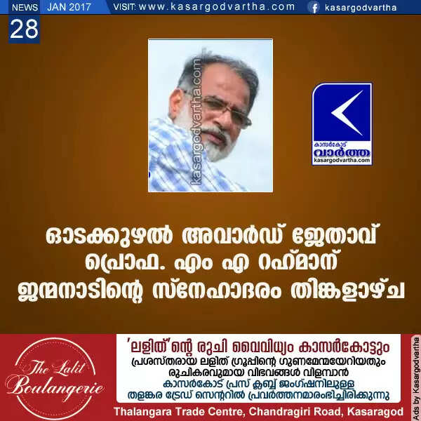 ഉദുമ: (www.kasargodvartha.com 28/01/2017) മലയാള ഭാഷയിലെ മികച്ച കൃതിക്കുള്ള ഓടക്കുഴല് അവാര്ഡ് നേടിയ പ്രൊഫ. എം എ റഹ് മാനെ ജന്മനാട് ആദരിക്കുന്നു. ഉദുമയിലെ സാംസ്കാരിക പ്രവര്ത്തകരുടെ വാട്സ്ആപ് ഗ്രൂപ്പായ ഉദുമക്കാര് കൂട്ടായ്മയാണ് സ്നേഹാദരം പരിപാടി സംഘടിപ്പിക്കുന്നത്. തിങ്കളാഴ്ച വൈകുന്നേരം മൂന്നു മണിക്ക് ഉദുമ ഗവണ്മെന്റ് ഹയര് സെക്കന്ഡറി സ്കൂള് ഓഡിറ്റോറിയത്തില് നടക്കുന്ന സ്നേഹാദര ചടങ്ങ് സാഹിത്യകാരന് സി വി ബാലകൃഷ്ണന് ഉദ്ഘാടനം ചെയ്യും.