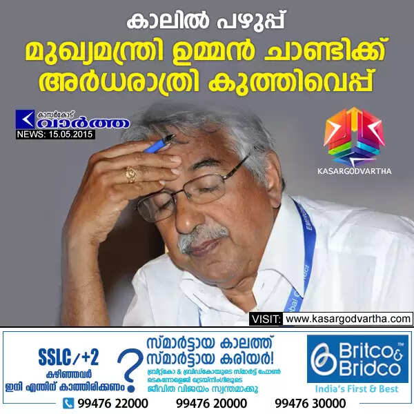 കാസര്‍കോട്: (www.kasargodvartha.com 15/05/2015) കാസര്‍കോട്ട് ജനസമ്പര്‍ക്ക പരിപാടിക്കെത്തിയ മുഖ്യമന്ത്രിക്ക് പരിപാടി കഴിഞ്ഞ് ഗസ്റ്റ് ഹൗസിലെത്തിയപ്പോള്‍ കാലില്‍ പഴുപ്പ് കണ്ടെത്തിയതിനെതുടര്‍ന്ന് അര്‍ധരാത്രി ഡോക്ടര്‍ പരിശോധിച്ച് കുത്തിവെപ്പ് നടത്തി.