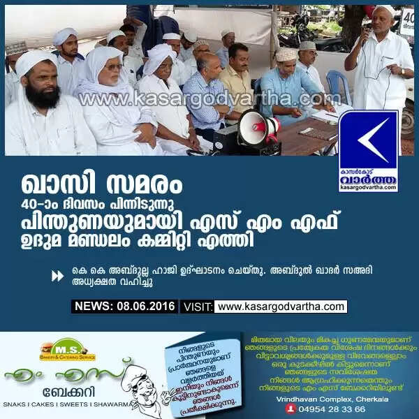 കാസര്‍കോട്: (www.kasargodvartha.com 08.06.2016) ഖാസി സി എം ഉസ്താദിന്റെ മരണത്തിലെ ദുരൂഹത പുറത്തുകൊണ്ടുവരണമെന്നാവശ്യപ്പെട്ട് നടത്തപ്പെടുന്ന അനിശ്ചിതകാല സമരത്തിന്റെ 40-ാം ദിവസം പിന്തുണയുമായി എസ് എം എഫ് ഉദുമ മണ്ഡലം കമ്മിറ്റി എത്തി. കെ കെ അബ്ദുല്ല ഹാജി ഉദ്ഘാടനം ചെയ്തു.
