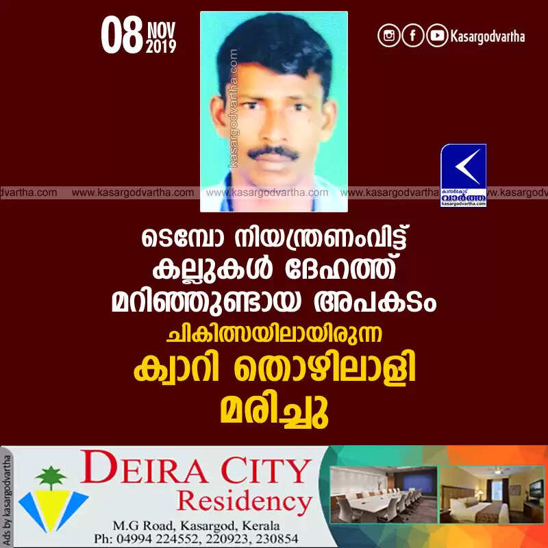 ടെമ്പോ നിയന്ത്രണംവിട്ട് കല്ലുകള് ദേഹത്ത് മറിഞ്ഞുണ്ടായ അപകടം; ചികിത്സയിലായിരുന്ന ക്വാറി തൊഴിലാളി മരിച്ചു