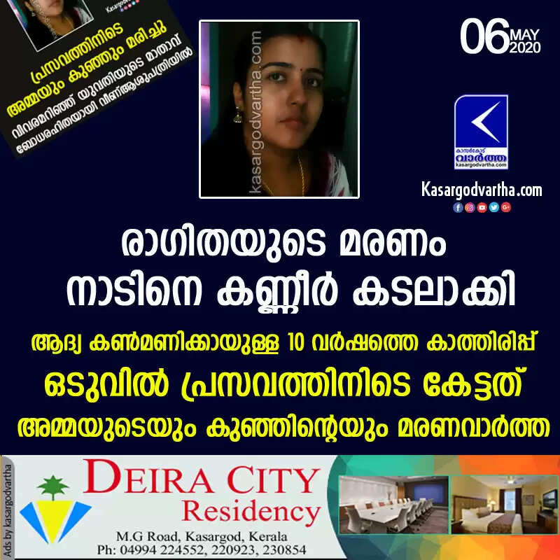 നീലേശ്വരം: (www.kasargodvartha.com 06.05.2020) നീലേശ്വരം പേരോല്‍ പത്തിലകണ്ടത്തെ ദാമോദരന്‍ - പുഷ്പ ദമ്പതികളുടെ മകള്‍ രാഗിത (28)യുടെ മരണം നാടിനെ കണ്ണീര്‍ കടലാക്കി. ആദ്യ കണ്‍മണിക്കായുള്ള 10 വര്‍ഷത്തെ കാത്തിരിപ്പിനൊടുവില്‍ അമ്മയുടെയും കുഞ്ഞിന്റെയും മരണവാര്‍ത്തയാണ് എത്തിയത്. ഇത് കുടുംബത്തെ തീര്‍ത്തം ദു:ഖത്തിലാഴ്ത്തി.
