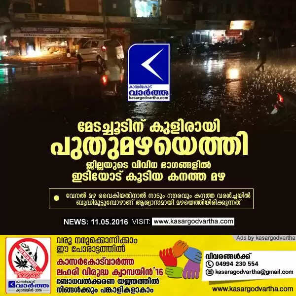 കാസര്കോട്: (www.kasargodvartha.com 11/05/2016) കത്തിക്കാളുന്ന മേടച്ചൂടിന് കുളിരായി പുതുമഴയെത്തി. ബുധനാഴ്ച വൈകിട്ടോടെ ജില്ലയിലെ വിവിധ ഭാഗങ്ങളില് ഇടിയോട് കൂടിയ മഴ ലഭിച്ചു. വേനല് മഴ വൈകിയതിനാല് നാടും നഗരവും കനത്ത വരള്ച്ചയില് ബുദ്ധിമുട്ടുമ്പോഴാണ് ആശ്വാസമായി മഴയെത്തിയിരിക്കുന്നത്.