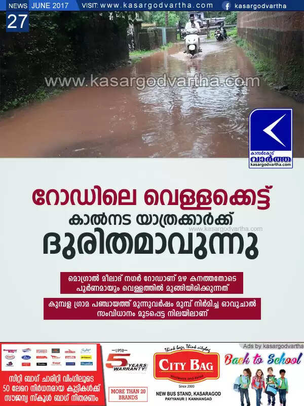 Keywords : Mogral, Road, Natives, Rain, Complaint, Kasaragod, Water, School, Students, Meelad Nagar, Rain water make obstacles for road users.